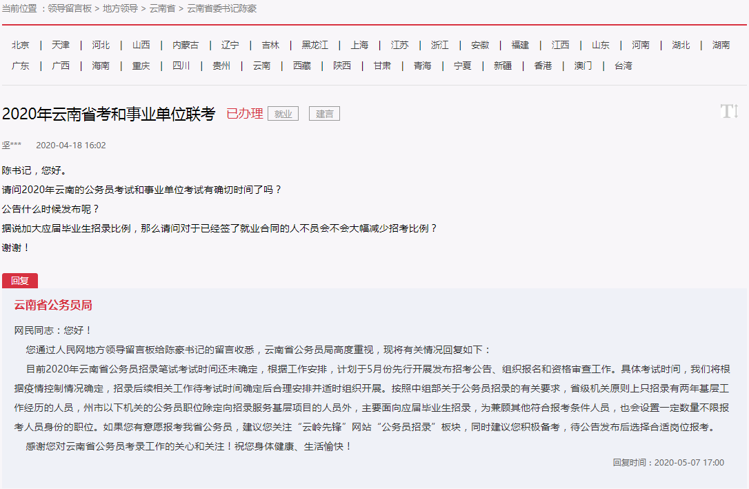 受疫情影響,2020年各類考試都推遲進(jìn)行,在就業(yè)嚴(yán)峻的情況下,眾多考生非常關(guān)注2020云南省考何時(shí)開(kāi)始。近日,在“人民網(wǎng)領(lǐng)導(dǎo)留言板”欄目中云南省公務(wù)員局就何時(shí)開(kāi)展2020省考進(jìn)行了答復(fù),具體內(nèi)容如下:
