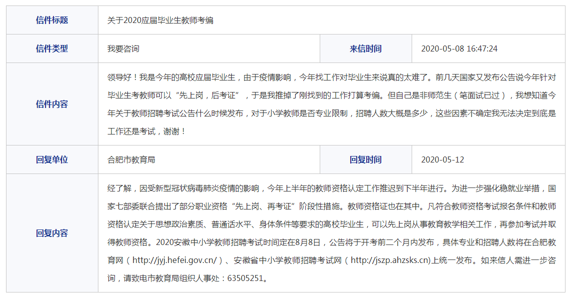 回復(fù)內(nèi)容:經(jīng)了解,因受新型冠狀病毒肺炎疫情的影響,今年上半年的教師資格認(rèn)定工作推遲到下半年進(jìn)行。為進(jìn)一步強(qiáng)化穩(wěn)就業(yè)舉措,國家七部委聯(lián)合提出了部分職業(yè)資格“先上崗、再考證”階段性措施。教師資格證也在其中。凡符合教師資格考試報(bào)名條件和教師資格認(rèn)定關(guān)于思想政治素質(zhì)、普通話水平、身體條件等要求的高校畢業(yè)生,可以先上崗從事教育教學(xué)相關(guān)工作,再參加考試并取得教師資格。2020安徽中小學(xué)教師招聘考試時間定在8月8日,公告將于開考前二個月內(nèi)發(fā)布,具體專業(yè)和招聘人數(shù)將在合肥教育網(wǎng)(http://jyj.hefei.gov.cn/)、安徽省中小學(xué)教師招聘考試網(wǎng)(http://jszp.ahzsks.cn)上統(tǒng)一發(fā)布。如來信人需進(jìn)一步咨詢,請致電市教育局組織人事處:63505251。