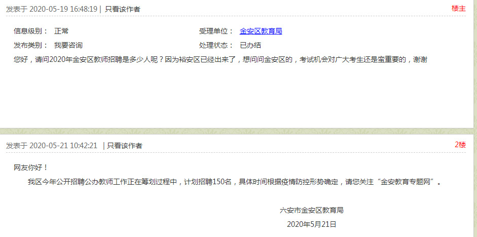 我區(qū)今年公開招聘公辦教師工作正在籌劃過程中,計劃招聘150名,具體時間根據(jù)疫情防控形勢確定,請您關(guān)注“金安教育專題網(wǎng)”。