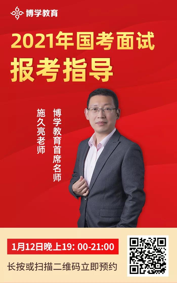 不打無準備之仗,為幫助考生們備考2021年國考面試,博學教育將于1月12日晚上19:00舉辦直播講座。首席名師施久亮老師帶您提前了解歷年國考面試的基本情況,以及不同部門的試題特點和評分要點等等,并提供專業(yè)的備考建議,干貨滿滿!