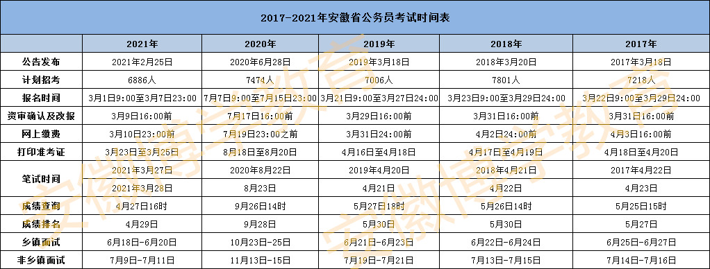 由上表可見,安徽公務員考試時間比較穩(wěn)定,預計2022年安徽省考2月中下旬左右出公告和報名,筆試時間3月中下旬,且近幾年都參加聯(lián)考,所以安徽繼續(xù)參加2022年聯(lián)考的幾率非常大,如果今年繼續(xù)參加。(具體時間安排以2022年安徽公務員公告為準)可生可根據(jù)此時間表做好復習規(guī)劃。