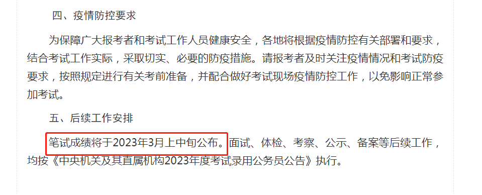 2022年12月16日,國(guó)家公務(wù)員局發(fā)布了《關(guān)于中央機(jī)關(guān)及其直屬機(jī)構(gòu)2023年度考試錄用公務(wù)員筆試時(shí)間安排及有關(guān)事項(xiàng)的公告》,其中有提到關(guān)于國(guó)考成績(jī)發(fā)布的時(shí)間:筆試成績(jī)將于2023年3月上中旬公布。
