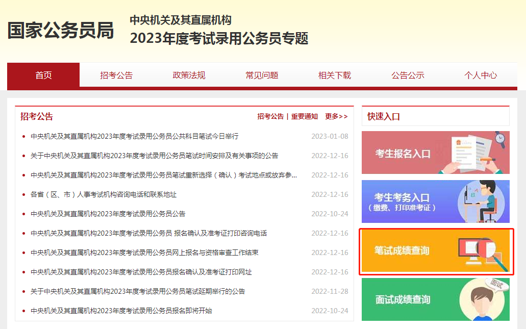 國(guó)考成績(jī)發(fā)布后,考生通過(guò)中央機(jī)關(guān)及其直屬機(jī)構(gòu)2023年度考試錄用公務(wù)員專題網(wǎng)站,進(jìn)入“筆試成績(jī)查詢”網(wǎng)頁(yè)即可查成績(jī),進(jìn)面名單可能會(huì)在查成績(jī)的同一天發(fā)布,也有可能會(huì)延遲一兩天發(fā)布。