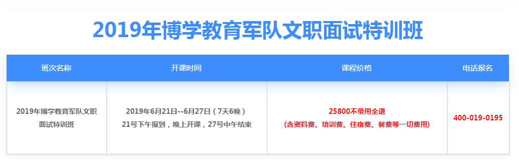 2019年博學(xué)教育軍隊(duì)文職面試特訓(xùn)班簡(jiǎn)章(點(diǎn)擊查看詳情)